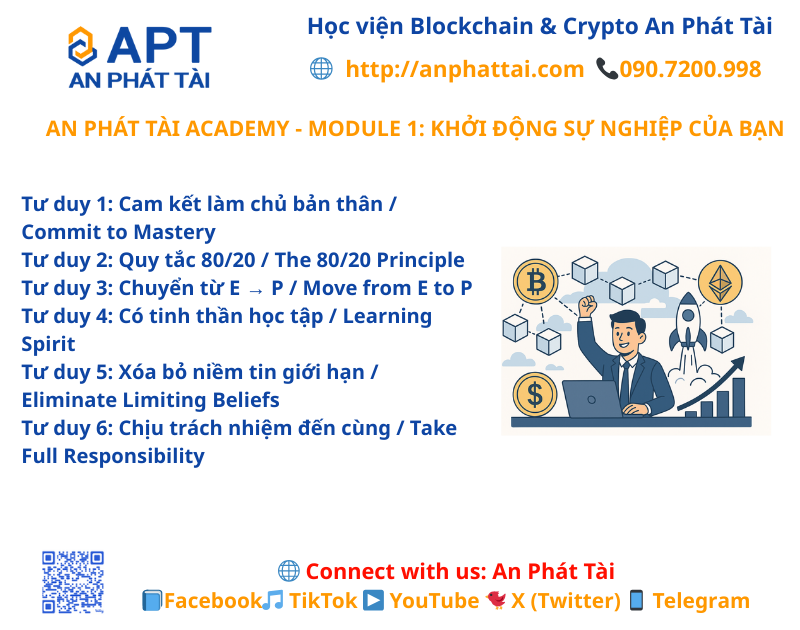 Tại An Phát Tài Academy, trước khi học bất kỳ kiến thức kỹ thuật nào về Blockchain – Crypto – Web3 – DeFi – AI, học viên bắt buộc phải đi qua 6 tư duy nền tảng này.