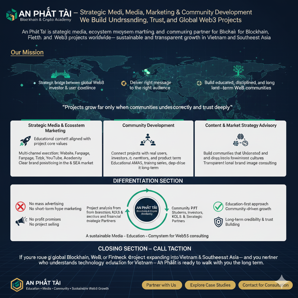 - An Phát Tài là đơn vị truyền thông chiến lược, marketing hệ sinh thái và phát triển cộng đồng cho các dự án Blockchain, Crypto, Fintech và Web3 trên toàn thế giới.
