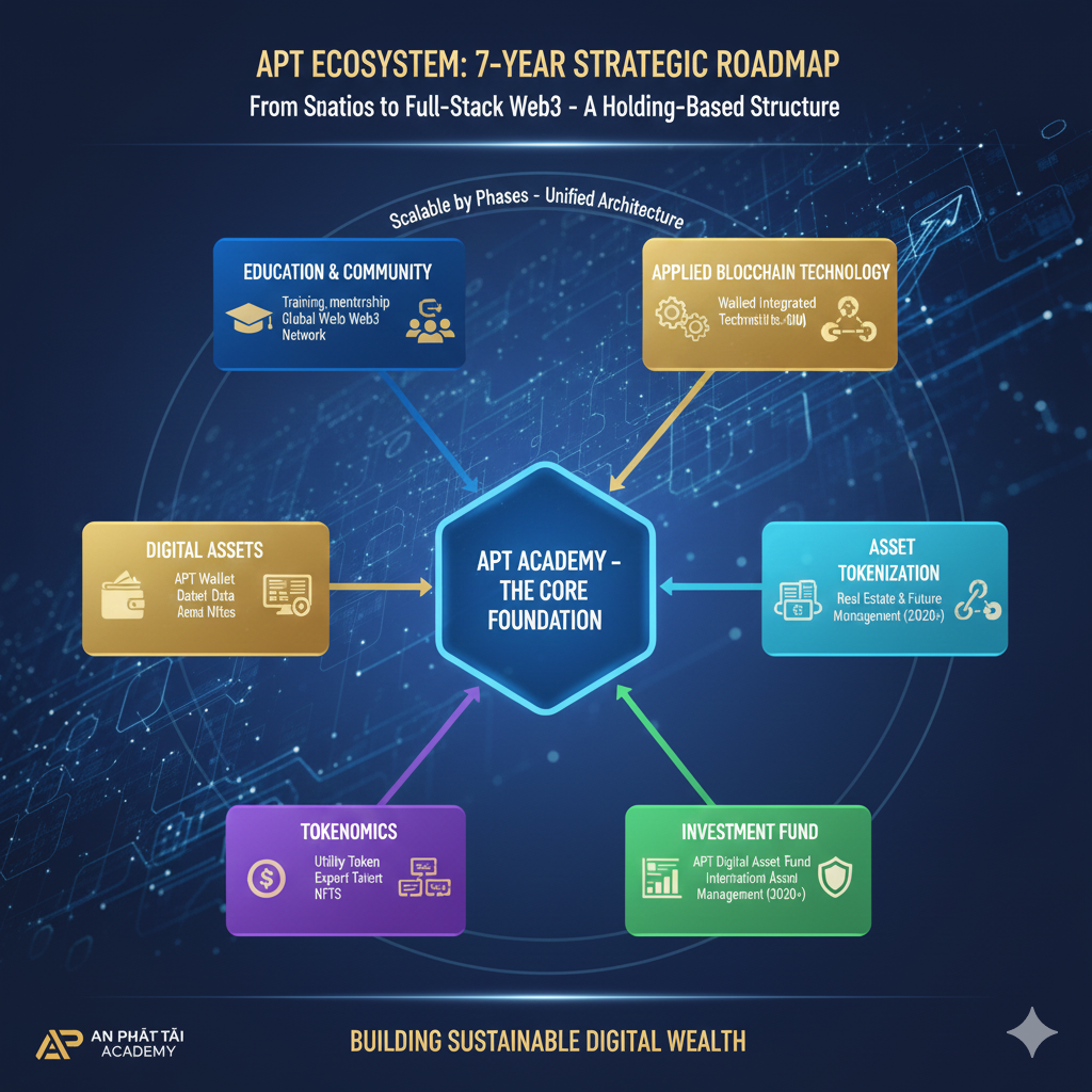 Hệ sinh thái An Phát Tài (APT Ecosystem) được xây dựng theo chiến lược 7 năm, với hạt nhân trung tâm là APT Academy – mô hình giáo dục Blockchain & Crypto hàng đầu Việt Nam.