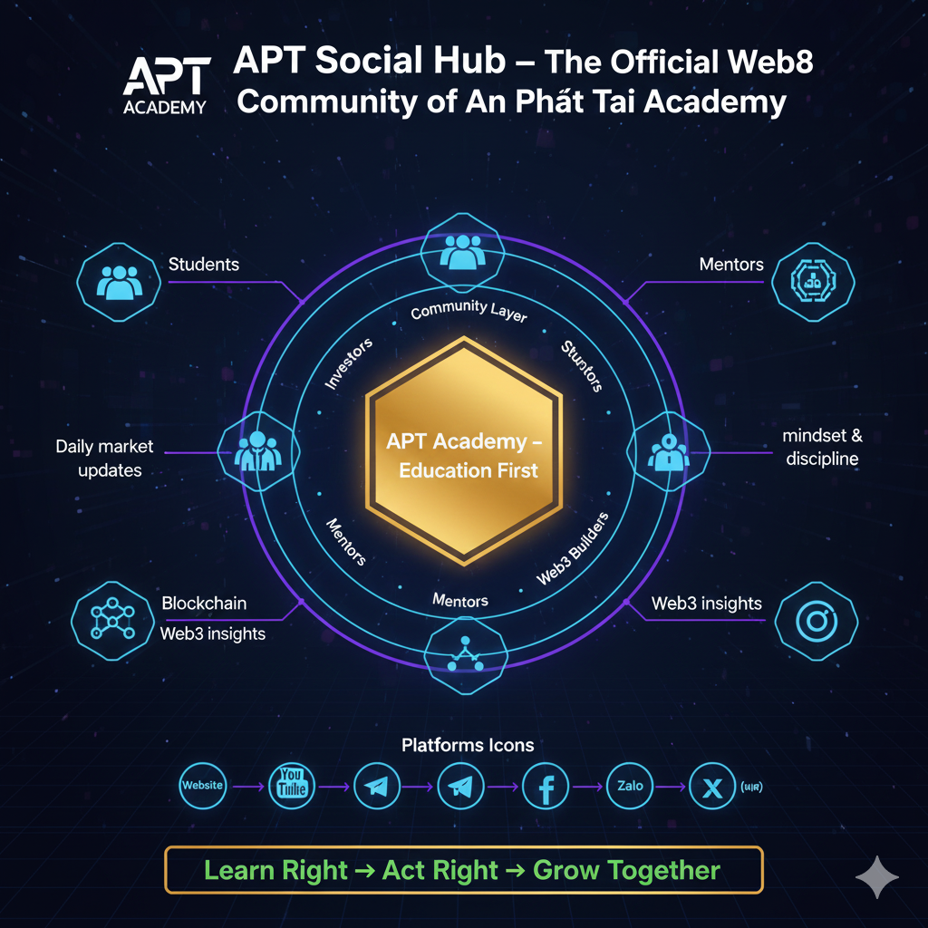 APT Social Hub là hệ thống cộng đồng đa nền tảng chính thức của Học viện Blockchain & Crypto An Phát Tài (APT Academy) – nơi hội tụ học viên, nhà đầu tư, chuyên gia, đối tác và cộng đồng Web3 cùng học tập, cập nhật và phát triển tư duy tài chính số mỗi ngày.
