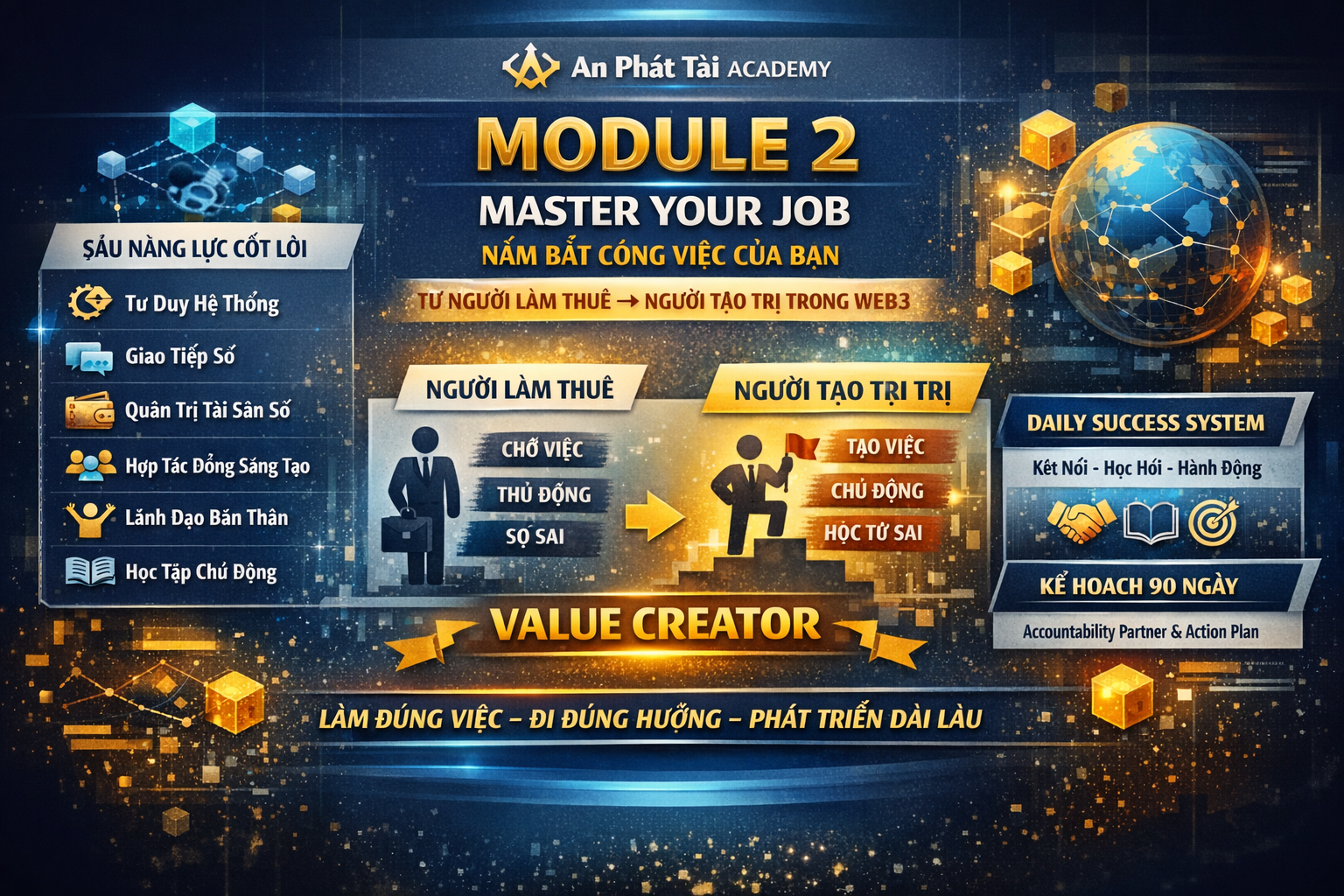 Module 2 – Master Your Job là học phần nền tảng trong chương trình đào tạo của An Phát Tài Academy, giúp học viên hiểu rõ vai trò – làm chủ công việc – chuyển hóa từ người thực thi sang người tạo giá trị trong hệ sinh thái Blockchain & Web3.
