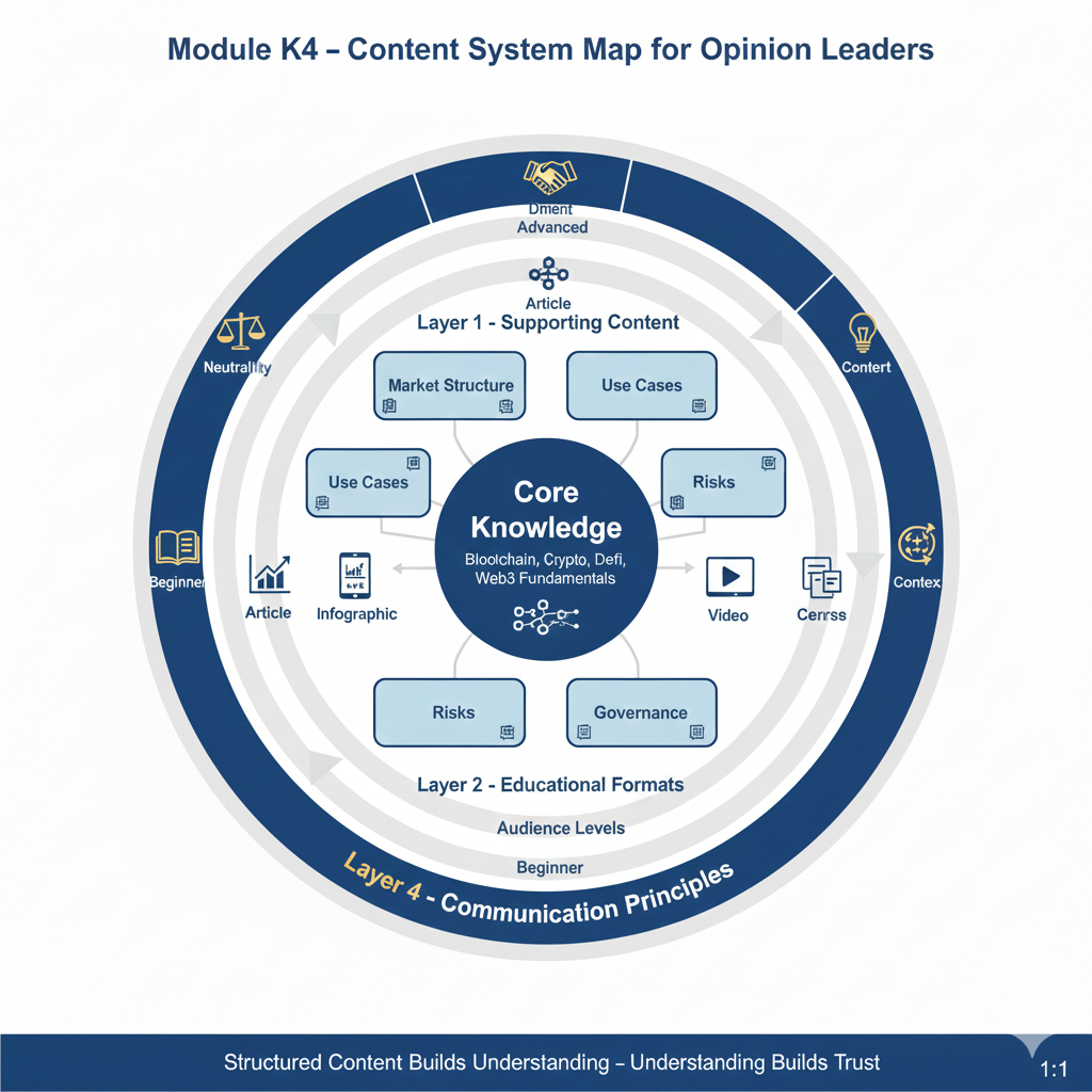 👉 Module K4 tập trung vào kiến trúc nội dung (Content Architecture) và truyền thông giáo dục (Educational Communication) – nền tảng để Opinion Leader: